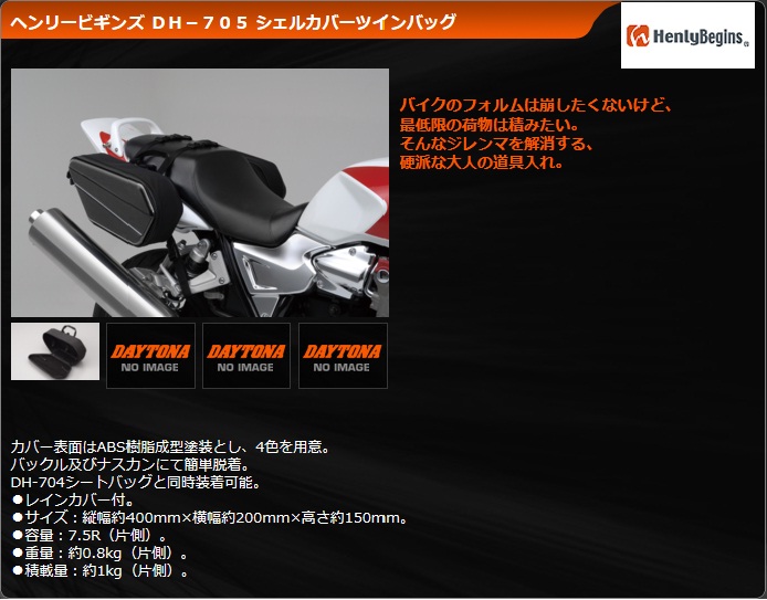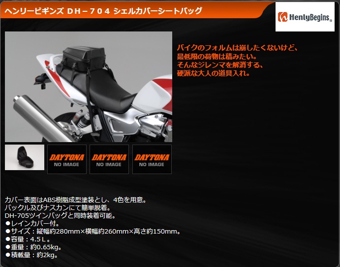 まずシートバッグですが、DAYTONAから発売されているHENLY BIGINS製のシェルカバーシートバッグです。容量は約4.5L。