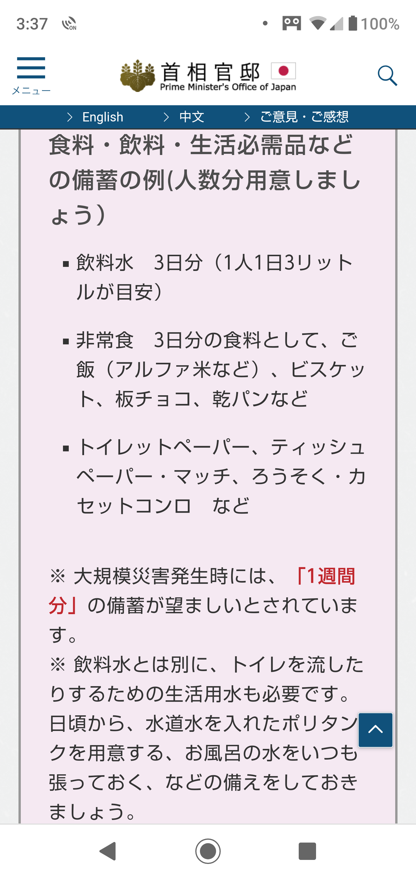 首相官邸では3日~1週間分の食料を用意しろとのことなので妥当な量だと思います。
