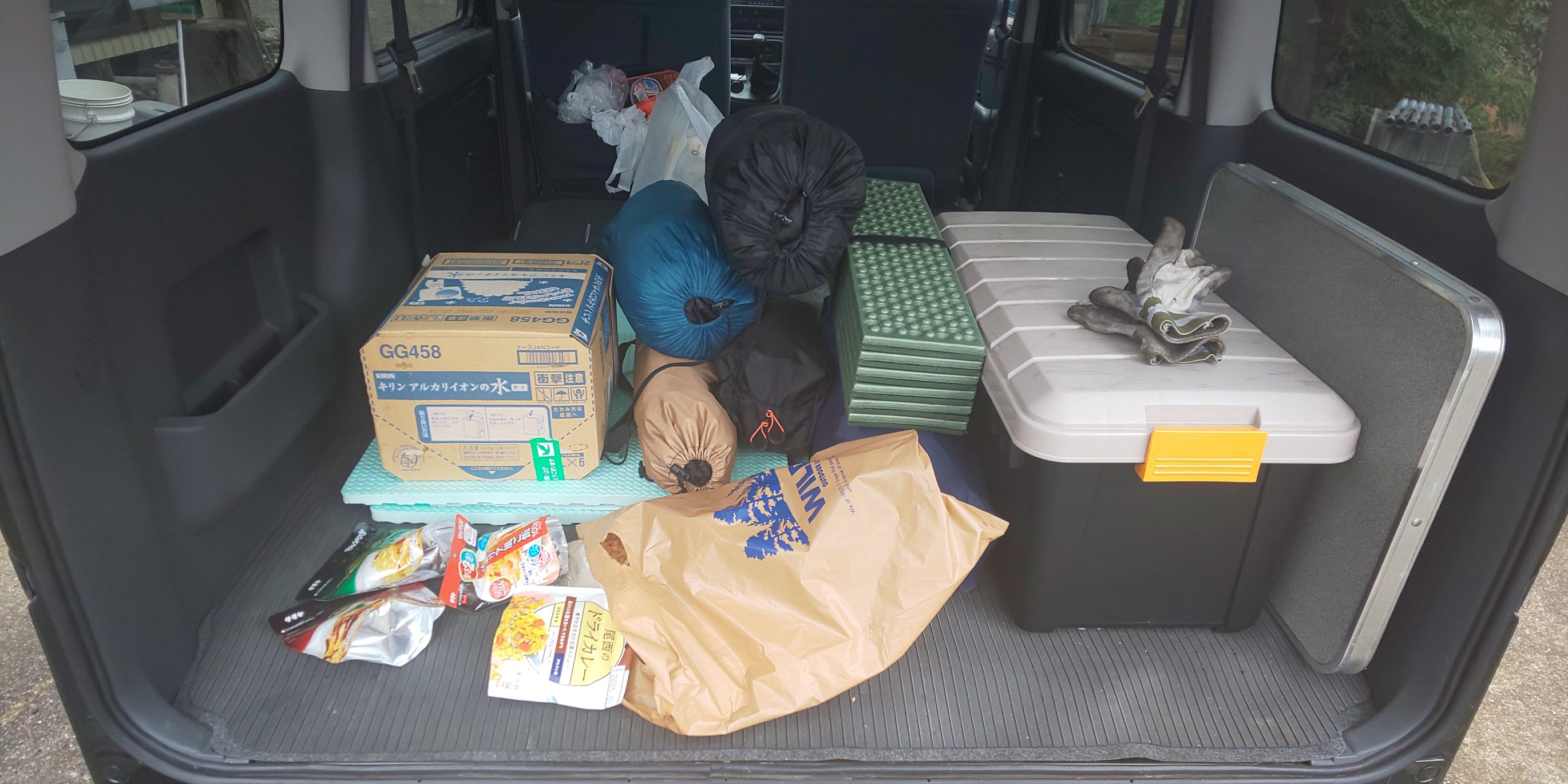 食料品以外だと普段のキャンプセットに予備のガスと薪の補充、レジャーシートと固形燃料、折り畳み水タンク7L分を追加して椅子と寝袋を3セット積載。